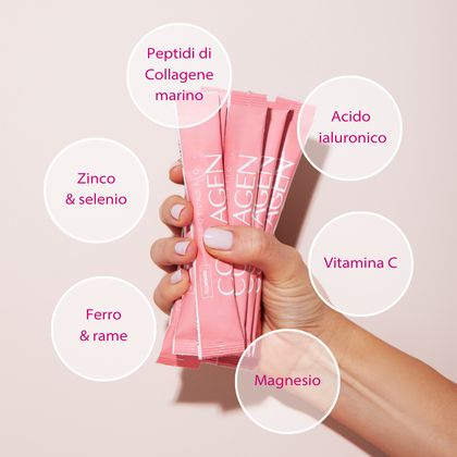 Ingredienti: Collagene di pesce idrolizzato, Lattato di magnesio, Aroma di lampone, Polvere di succo di radice di barbabietola (Beta vulgaris L., radix), Correttore di acidità: Acido citrico, Gluconato ferroso, Acido L-ascorbico (Vitamina C), Citrato di Zinco, Ialuronato di sodio, Edulcorante: Glicosidi steviolici da stevia, Gluconato di rame, Selenito di sodio.