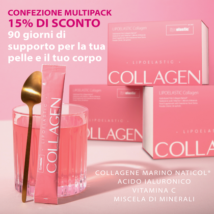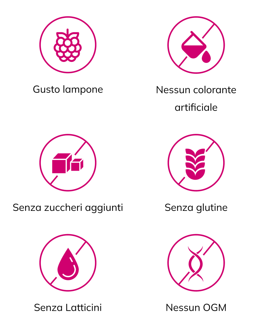 Ingredienti: Collagene di pesce idrolizzato, Lattato di magnesio, Aroma di lampone, Polvere di succo di radice di barbabietola (Beta vulgaris L., radix), Correttore di acidità: Acido citrico, Gluconato ferroso, Acido L-ascorbico (Vitamina C), Citrato di Zinco, Ialuronato di sodio, Edulcorante: Glicosidi steviolici da stevia, Gluconato di rame, Selenito di sodio.